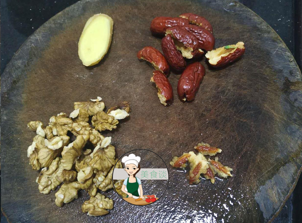 准备食材:乌鸡半只、核桃5个、红枣5颗、姜2片、盐少许