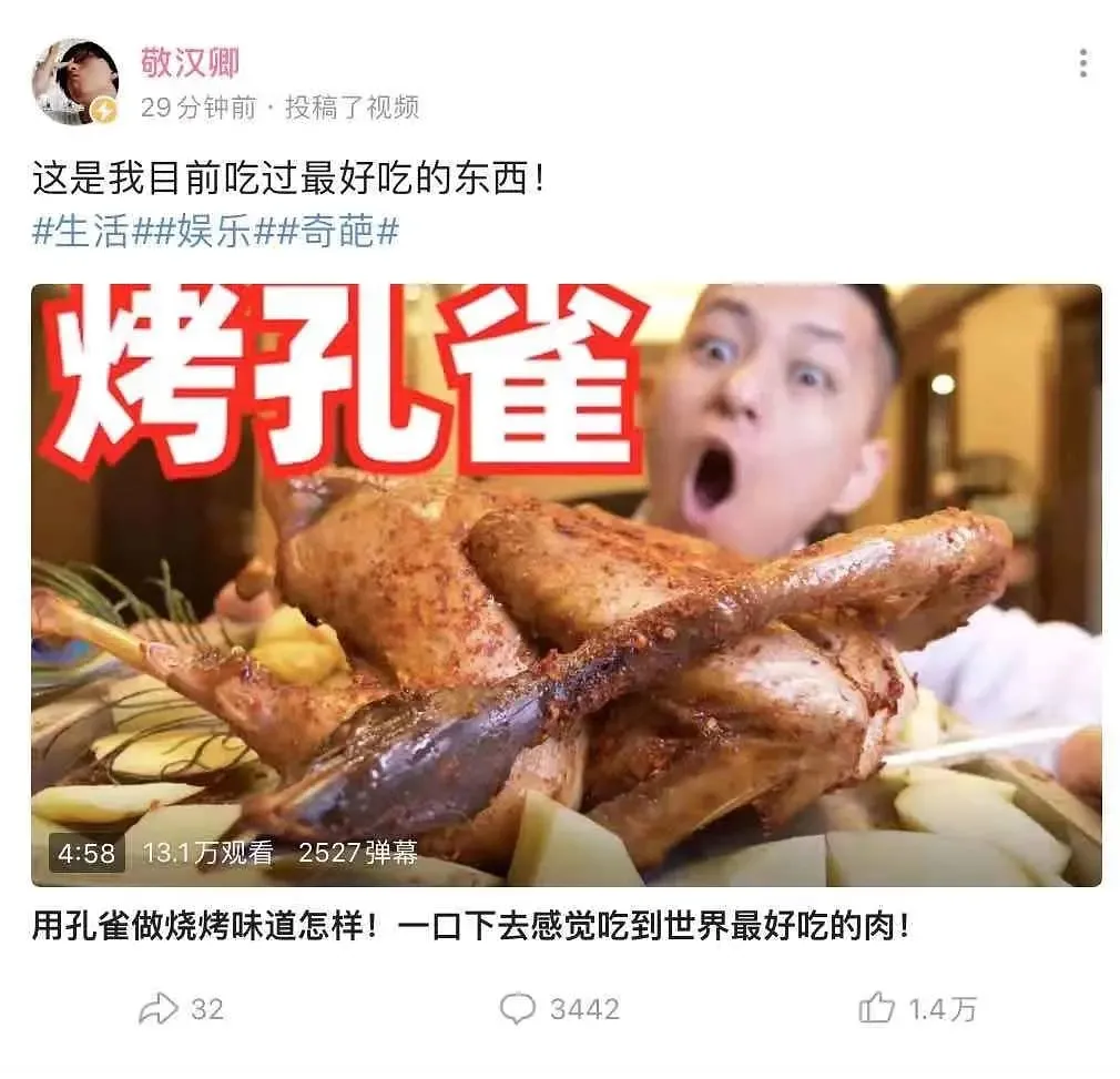 虽然说品尝正规人工养殖的孔雀是可以的,但还是有人质疑敬汉卿身为百万up主,在敏感时期打野味擦边球,很难说不会有粉丝跟风模仿。