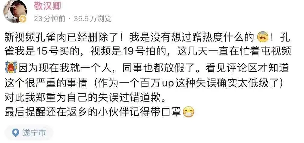 孔雀肉事件发生之后不久,敬汉卿删掉了这条视频并发布道歉声明,说孔雀是之前买的,视频也是之前拍的,不是刻意为了蹭热度。
