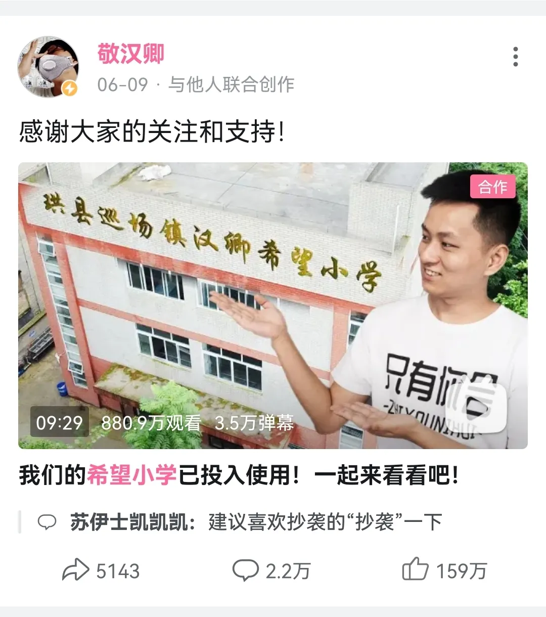 而且这个善举确实不是口嗨,今年六月,希望小学的后续来了。