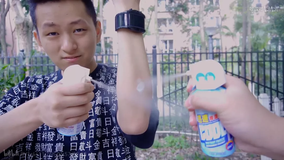 要证明冷冻喷雾真的能物理降温,他拿冷冻喷雾对着一碗水狂喷。